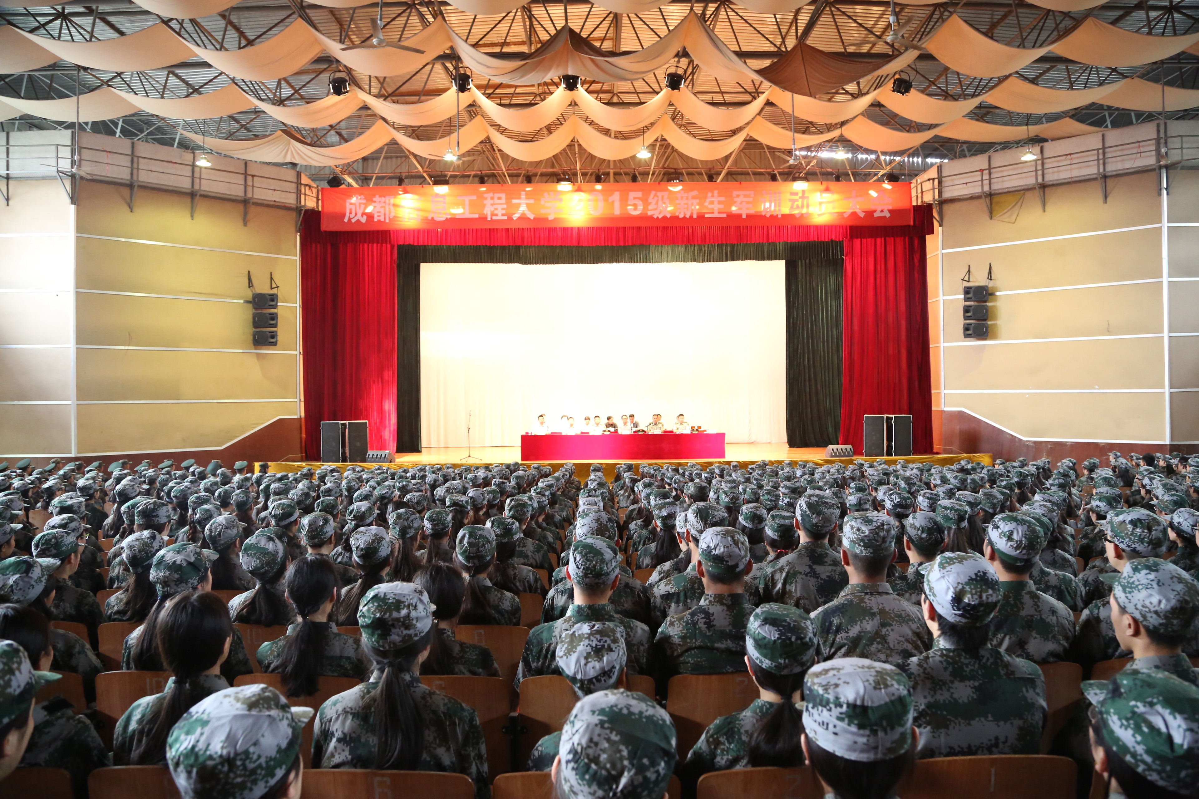 【本网讯】9月11日,新莆京官网2015级新生军训动员大会分别在航空港校区第一田径场和龙泉校区大礼堂举行。学校副校长于世祥,武警警官学院军训团团长李志强中校、政委孙剑飞中校、副团长李伟少校,党政办公室、二炮选培办、宣传统战部、教务处、学生工作处、招生就业处、后勤管理处、保卫处、校团委、后勤服务公司等部门负责人,各学院党总支书记、副书记,全体军训教官、国防生助理军训教官,2015级全体新生及辅导员参加了大会。大会在两个校区分别由学生工作处处长戴丽红和副处长潘光林主持。