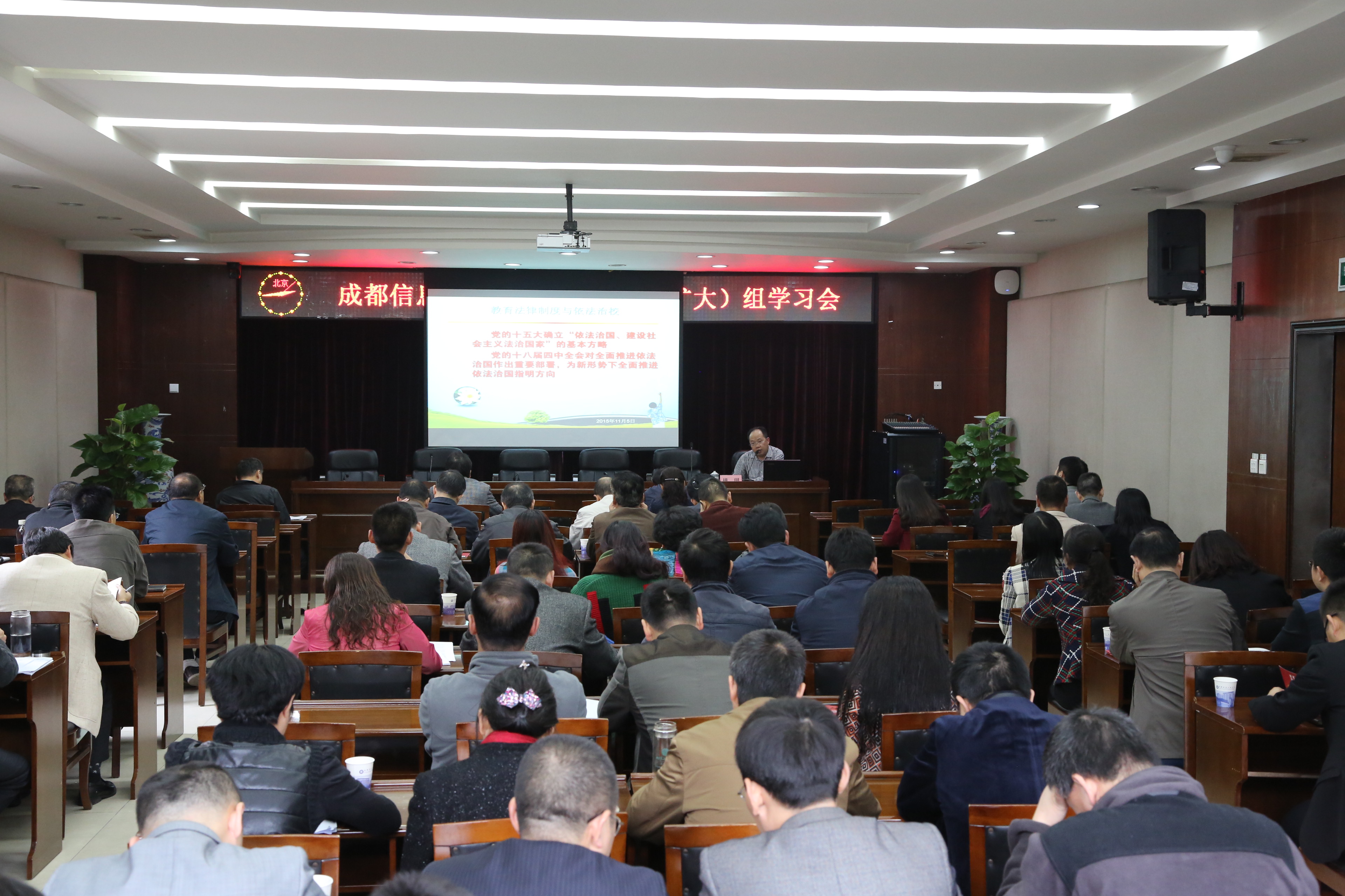 【本网讯】11月5日,学校党委中心(扩大)组在航空港校区行政楼一会议室召开依法治校专题学习研讨会。四川省教育厅政策法规与综合改革处处长傅明应邀作《教育法律制度与依法治校》专题辅导报告。全体中层以上干部参加了学习研讨会。会议由党委书记赖廷谦主持。