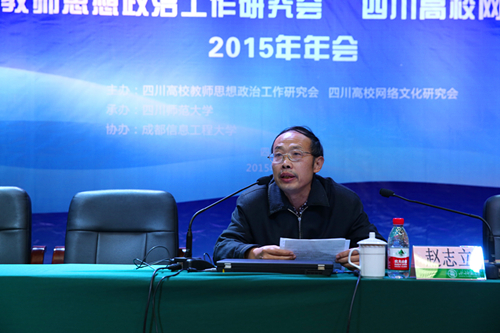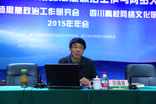 【本网讯】 11月27日,由四川师范大学主办、新莆京官网协办的四川高校教师思想政治工作研究会暨四川高校网络文化研究会2015年年会在四川师范大学狮子山校区学术报告厅召开。四川省教育厅宣传思想工作处处长陈小红,四川省社科联规划办主任黄兵,四川师范大学党委副书记唐尚朴,四川高校网络文化研究会会长、新莆京官网党委副书记敬枫蓉出席大会。全省86所高校宣传部、相关职能部门的负责人和有关方面的同志共120余人参加会议。新莆京官网宣传统战部部长饶华、副部长丁恒康,文化艺术学院教授蓝鹰参会。大会由四川高校教师思想政治工作研究会会长、四川师范大学党委副书记王万民主持。