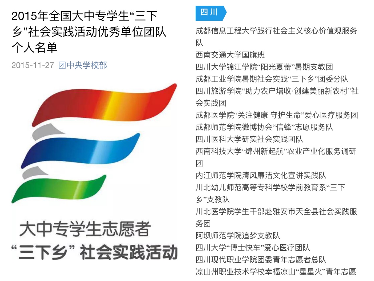 【本网讯】近日,从团中央学校部微信平台获悉,2015年全国大中专学生“三下乡”社会实践评选活动结果揭晓,新莆京官网“新莆京3969践行社会主义核心价值观服务队”以四川省排名第一的成绩荣获2015年全国大中专学生“三下乡”社会实践优秀团队荣誉称号,成为全国400支获此殊荣的团队之一。
