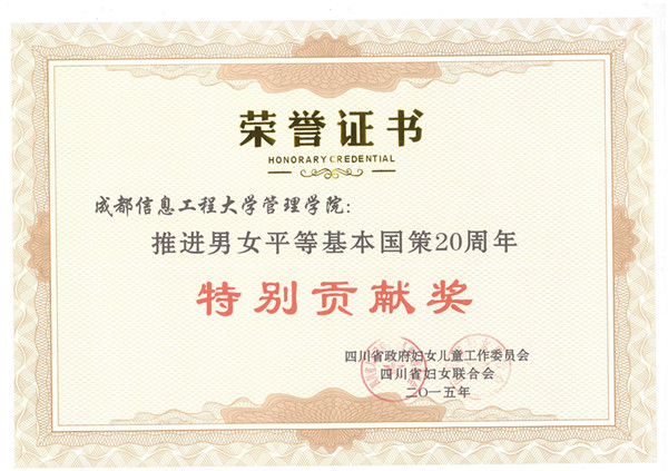 【本网讯】日前,四川省政府妇女儿童工作委员会、四川省妇女联合会联合发文,授予四川省人大内务司法委员会等291个单位、王飙等109名同志“推进男女平等基本国策二十周年特别贡献奖”荣誉称号,新莆京官网管理学院作为省级部门先进单位代表之一,获得“推进男女平等基本国策二十周年特别贡献奖”荣誉称号。