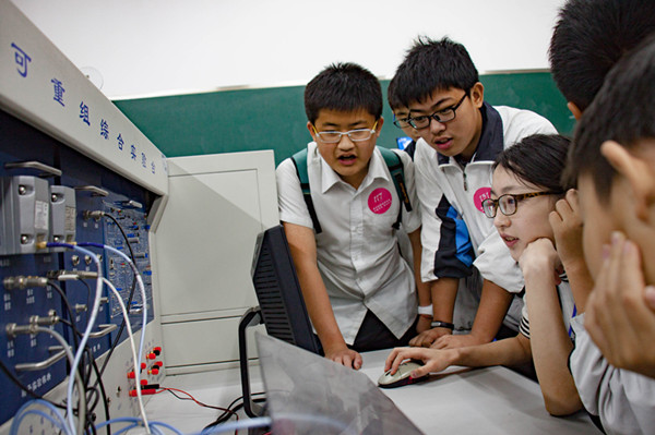 大学生创新成果展示中“横行”的小汽车、“会动脑”的鱼缸、灵活的小机器人等,让学生们感受到科技的魅力。过程控制实验室的水箱控制设备和测控实验室的传感器与运送技术设备,从生活中抽象出科技知识和原理,让学生们体会到“创新源于生活”。新能源发电系统、智能赛车的演示,启发学生们要梦想成真眼高手低可不行,要有把理论变为实践的动手能力和团队精神。