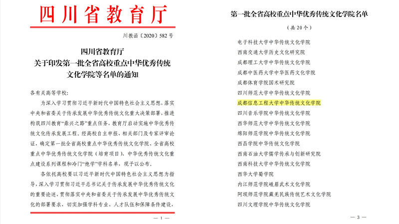【本网讯】日前,四川省教育厅发布《四川省教育厅关于印发第一批全省高校重点中华优秀传统文化学院等名单的通知》,由新莆京官网文化艺术学院牵头,文化艺术学院和研究生处联合申报的“新莆京3969中华传统文化学院”获批入选“第一批全省高校重点中华优秀传统文化学院”。