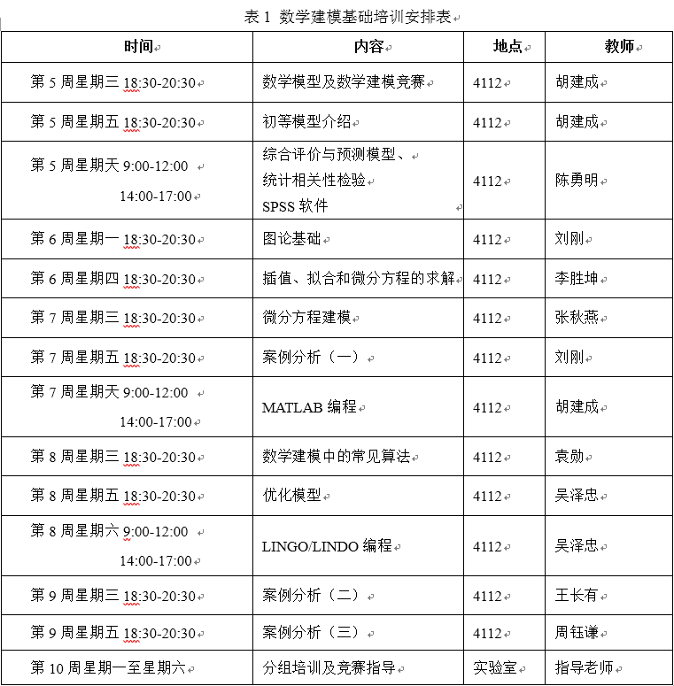 为了培养新莆京官网学生的创新意识及运用数学方法和计算机技术解决实际问题的能力,应用数学学院2019年继续组织和指导大学生数学建模竞赛系列活动,竞赛主要包括:全国大学生数学建模竞赛选拔赛(即五一数学建模竞赛),2019年全国大学生数学建模竞赛,全国高校密码数学挑战赛等。应用数学学院数学建模指导组从第五周到第十周开始培训,分别从数学建模基础、数学建模算法、数学建模竞赛、数学建模案例分析到常用软件等方面进行培训,欢迎对数学建模及数学建模竞赛的同学积极报名参加培训,培训安排见表1。