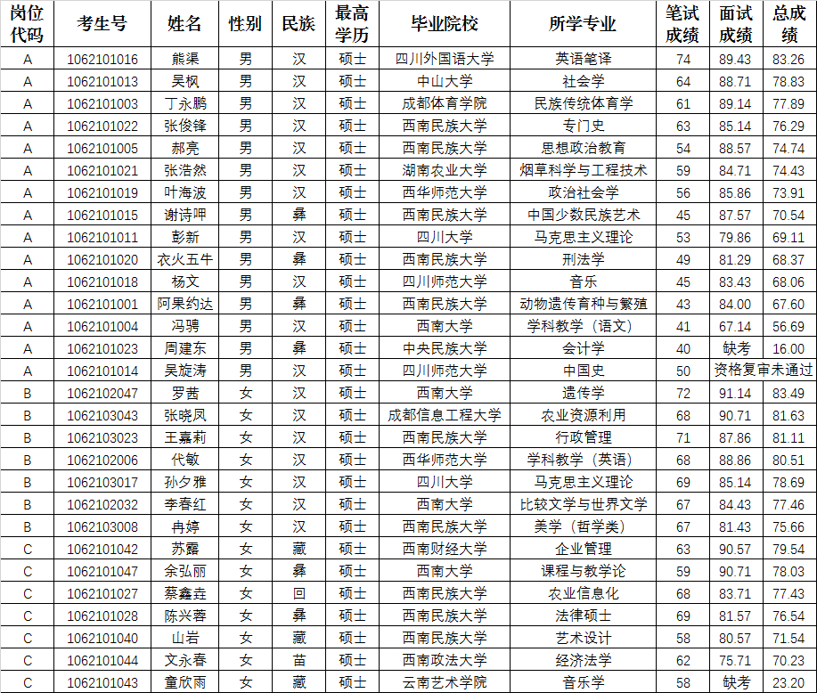 新莆京39692019年公开招聘合同制专职辅导员A、B、C岗面试已于2019年7月24日结束,现将面试成绩和总成绩予以公布。根据《新莆京39692019年公开招聘合同制专职辅导员公告》,考试总成绩以笔试成绩占40%、面试成绩占60%加总计算。现分岗位按总成绩排名予以公布,公布名单详见附件。