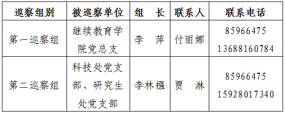 巡察期间,全校师生若对以上被巡察单位有意见和建议,可通过电话、邮箱或意见箱等渠道与巡察组联系。同时,欢迎广大师生对党委巡察组进行监督,提出意见建议。