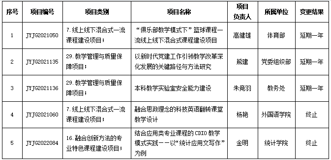 根据《关于开展2021-2022年本科教育教学研究与改革项目暨本科教学工程项目结题验收、年度检查工作的通知》(教务发〔2023〕1号),部分项目负责人主动提出项目延期、终止的申请,经所属单位同意、教务处审批,现将相关项目名单予以公示。