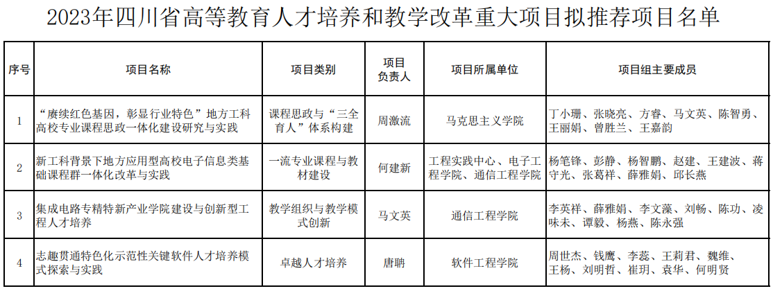 根据《四川省教育厅关于开展2023年四川省高等教育人才培养和教学改革重大项目申报工作的通知》文件要求,推荐前期立项且有较好研究、实践基础的项目优先申报,经各单位推荐及校内外专家评审,新莆京官网拟推荐《“赓续红色基因,彰显行业特色”地方工科高校专业课程思政一体化建设研究与实践》等4个项目申报2023年省级教改重大项目,详细名单见下表。