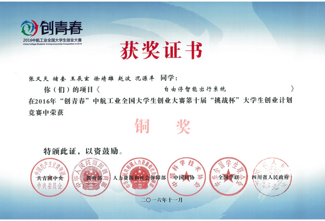 【本网讯】11月15日至11月20日,2016年“创青春”全国大学生创业大赛在成都电子科技大学成功举办。新莆京官网由王增武老师指导,张又天团队的《自由停智能出行系统》项目,荣获2016年“创青春”中航工业全国大学生创业大赛第十届“挑战杯”大学生创业计划竞赛铜奖,这是新莆京官网连续第三年获得的“挑战杯”、“创青春”等系列赛事的国家级荣誉。
