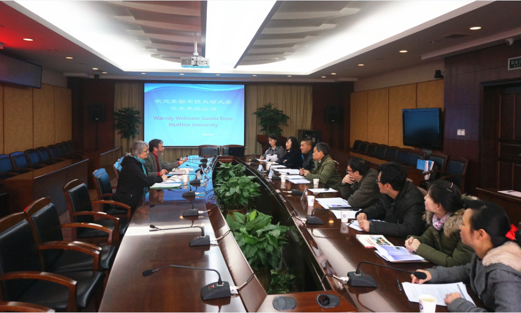 【本网讯】2月28日上午,美国布拉夫顿大学(Bluffton University)跨文化项目部主任Paul Neufeld Weaver先生、招生代表Jeanette Hanson女士一行来校访问并在行政楼第七会议室参加交流会议,商讨两校合作事宜。会议由国际交流与合作处副处长刘伟主持,外国语学院副院长杨云安、应用数学学院副院长吴泽忠、教务办副主任覃仕霞、国际交流与合作处科长盖秋艳,教师代表李保军、杜元花参加会议。