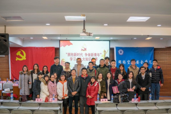 【本网讯】为深入学习贯彻党的十九大精神、深入推进“两学一做”学习教育常态化,2017年12月19日晚,由网络空间安全学院党总支主办,网络空间安全学院学生党支部、网络空间安全学院团委协办的“拥抱新时代 争做新青年”------深入学习党的十九大知识竞赛决赛在新莆京官网学术报告厅举办。网络空间安全学院党总支书记陈麟,总支所有委员、各支部书记、委员、辅导员、全体学生党员、积极分子参加了本次活动。