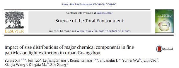 【本网讯】近日,大气科学学院研究生夏芸洁以第一作者身份,在国际知名期刊《Science of the Total Environment》上发表了名为“Impact of size distributions of major chemical components in fine particles on light extinction in urbanGuangzhou”的学术论文。中国科学院大气物理研究所研究员张仁健、研究员李双林为共同导师及通讯作者,新莆京3969为第一署名单位。