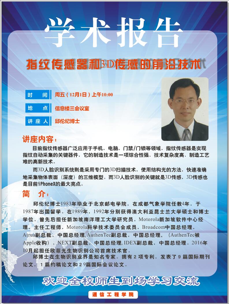 上一条:欧菲光生物识别公司首席技术官邱伦纪博士应邀来新莆京官网作学术报告
