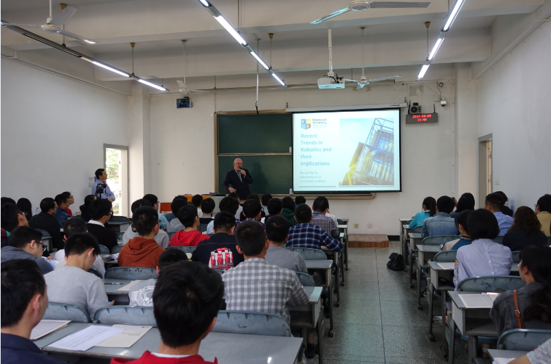 Ronan Reilly 教授介绍了国立爱尔兰梅努斯大学,并作了题为“Recent trends in robotics and their implications”的学术讲座。他介绍了传统机器人及其局限性,结合大数据、人工智能技术对机器人领域发展趋势及对未来的影响进行了分析,并对当前热门的深度神经网络技术—Differential Neural Computer模型进行了分析。他认为,该模型比其它模型更具优势,在教育、农业、医疗、制造业等领域具有极大的应用潜力。讲座现场,Reilly教授还分享了当前最新的、能促进技术发展的硬件开发技术、新的机器学习算法等知识,对这些发展趋势在工作自动化和岗位创造领域所产生的影响做出了评估,并分析了当前机器人技术的优缺点及其未来发展趋势。