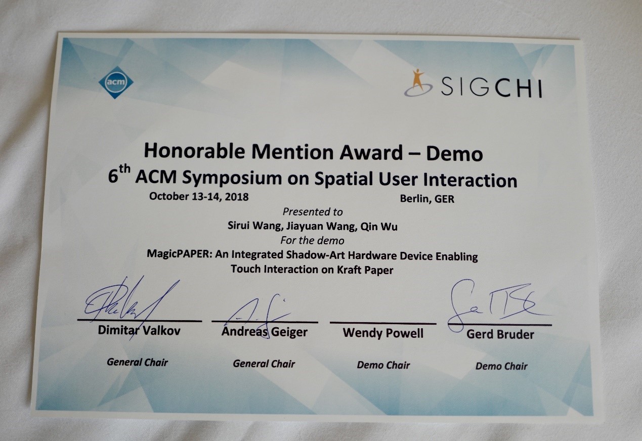 在ACM SUI 2018国际会议中,吴琴老师指导的MagicPAPER项目同多个硕士博士团队的项目中同台竞技,其精彩展示得到现场多数参会人的赞誉,得到专业评审肯定,获得了现场DEMO演示中的“最佳荣誉奖”,并受邀参与UIST 2018 Demo Track演示。