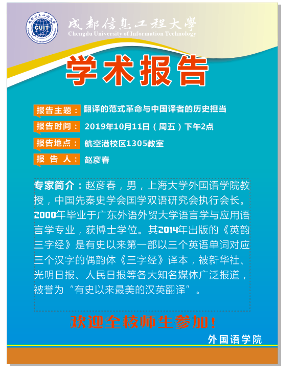 上一条:上海大学外国语学院赵彦春教授来我院开办学术讲座