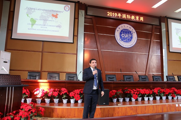 Juan Pablo Suarez做了题为“China-Latinamerica Relations”的学术讲座。他向大家展现了玻利维亚近几年来的基本经济数据和中国的贸易数据统计,展现了近几年来玻利维亚的经济发展状况和中国的合作交流状况;与同学们分享交流了拉丁美洲特色风景,美食,教育,文化等相关内容。他谈到中国与拉丁美洲具有巨大的合作潜力,对中国和拉丁美洲未来合作发展充满信心与期待,同时也诚挚的邀请同学们到拉丁美洲游学。