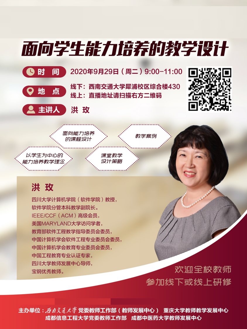 本次培训特邀四川大学计算机学院(软件学院)洪玫教授,针对以学生为中心的能力培养教学理念、面向能力培养的课程设计、课堂教学设计策略等内容开展培训。洪玫教授在两个半小时的直播讲座中,从“以学生为中心的能力培养教学理念”、“面向能力培养的课程设计”、“课堂教学设计策略”和丰富的教学案例四个方面围绕题目进行了深入浅出的讲解。参培教师们反应热烈,积极与洪教授就自己授课过程中面临的问题进行探讨和深入交流。